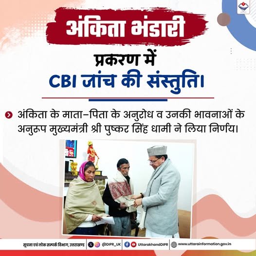 देहरादून -मुख्यमंत्री पुष्कर सिंह धामी ने स्वर्गीय अंकिता भंडारी के माता–पिता की अनुरोध व उनकी भावनाओं का सम्मान करते हुए अंकिता भंडारी प्रकरण की CBI जांच कराए जाने की संस्तुति प्रदान की है ।