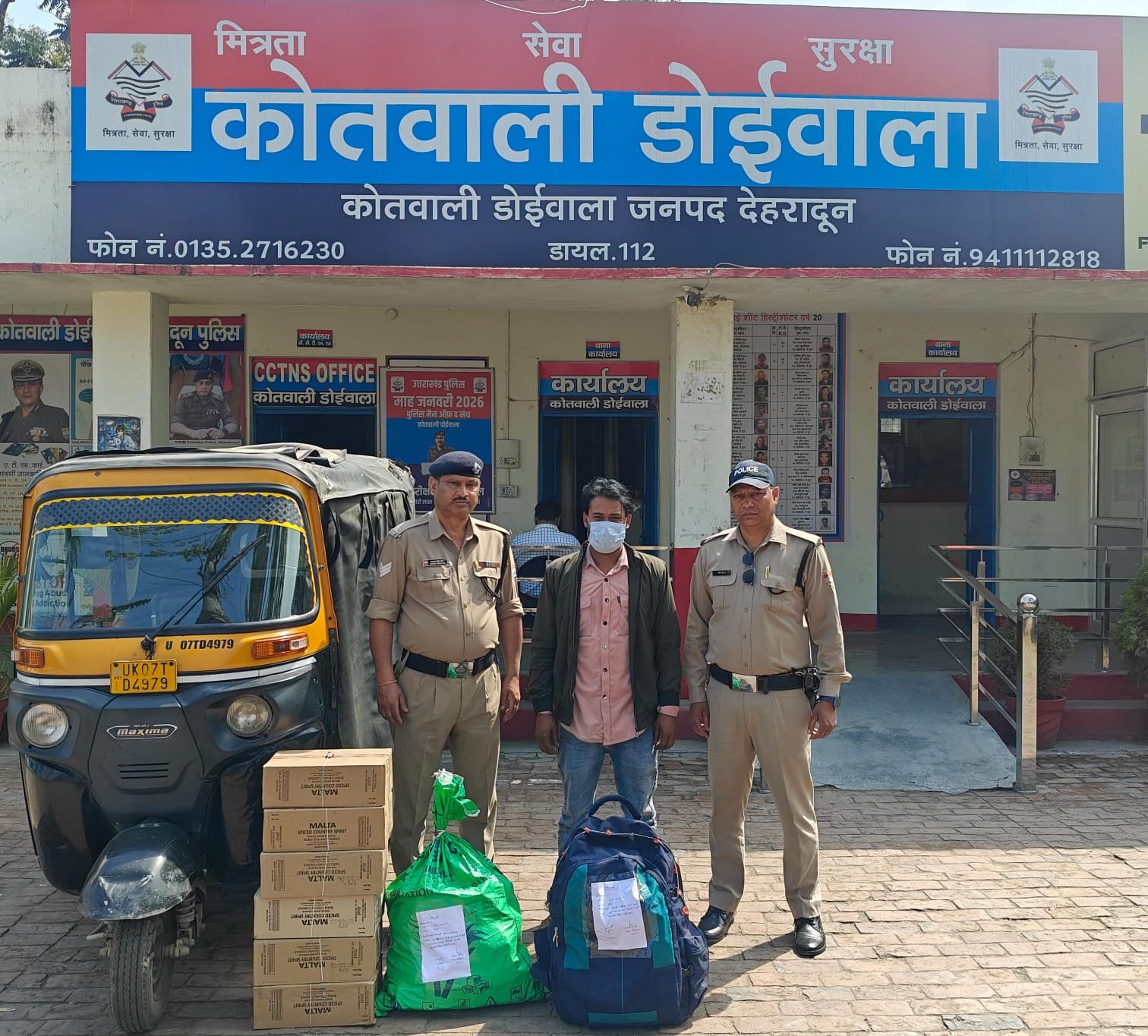 01: कोतवाली डोईवाला: थाना क्षेत्रान्तर्गत अलग-अलग स्थानो से 08 पेटी अवैध देसी शराब तथा 04 पेटी अवैध अंग्रेजी शराब के साथ 03 अभिएक को किया गिरफ्तार, शराब तस्करी में प्रयुक्त आटो को किया सीज।
